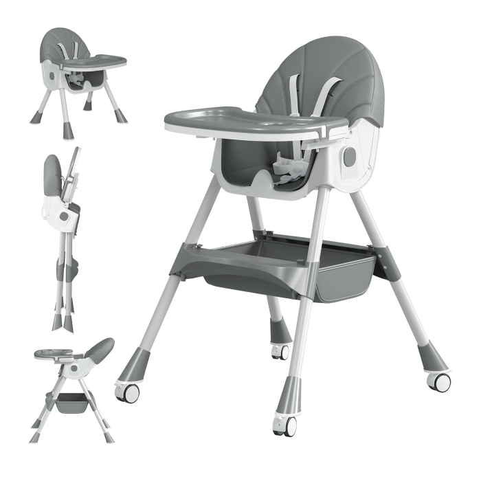 Scaunul este prevazut cu inaltime reglabila, avand o inaltime totala de aproximativ 92 cm, o latime a sezutului de aproximativ 35 cm si o adancime a bazei de aproximativ 61 cm, oferind stabilitate si siguranta sporita in timpul utilizarii. Tava ajustabila si detasabila, cu latime de aproximativ 40 cm, permite pozitionarea corecta fata de copil si o curatare rapida si usoara dupa fiecare utilizare.